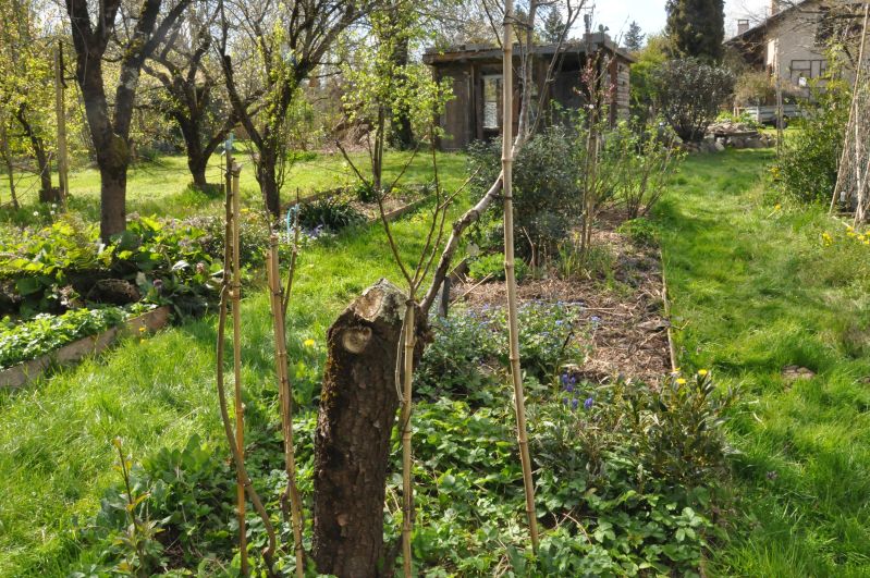 D’année en année, des branches meurent, la production devient rare chez les deux Reine Claude d’Oullins. Nous taillons drastiquement en 2025 pour favoriser un redémarrage. Au printemps 2026, quelques rejets sont sélectionnés autour de l’un d’eux et greffés avec des petites pousses du pied mère. A suivre…